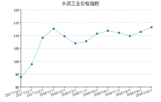 2018年10月,水泥工(gong)業產品出廠價(jia)格指數為113.25,比上(shang)(shang)月上(shang)(shang)漲(zhang)1.70%,比去年同(tong)月上(shang)(shang)漲(zhang)20.72%,一月至本月平均比去年同(tong)期上(shang)(shang)漲(zhang)22.73%。