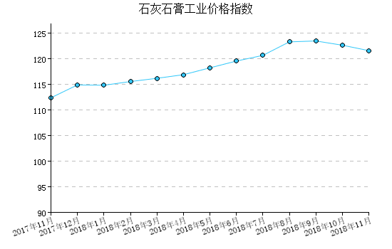 2018年(nian)11月(yue),石灰石膏工業產(chan)品(pin)出廠(chang)價(jia)格指數(shu)為121.54,比上月(yue)下降0.86%,比去年(nian)同(tong)月(yue)上漲8.18%,一月(yue)至(zhi)本(ben)月(yue)平均比去年(nian)同(tong)期(qi)上漲7.35%。