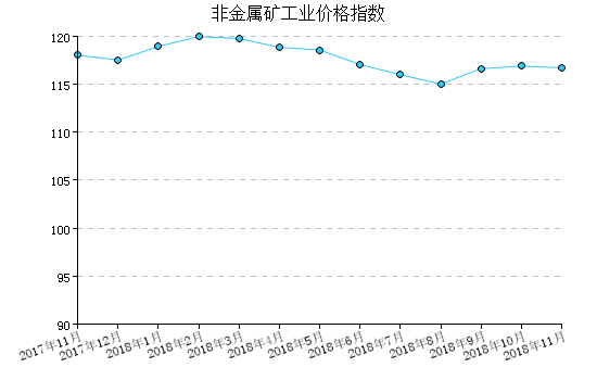 2018年11月(yue),非金屬(shu)礦工(gong)業產品出廠(chang)價格指(zhi)數為116.73,比(bi)上月(yue)下(xia)降0.14%,比(bi)去年同月(yue)下(xia)降1.12%,一月(yue)至本月(yue)平均比(bi)去年同期(qi)上漲8.46%。 圖(tu) 1:非金屬(shu)礦工(gong)業產品出廠(chang)價格指(zhi)數