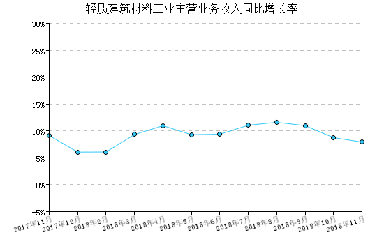 2018年11月規模以上工(gong)業(ye)(ye)增(zeng)加值同比增(zeng)長5.40%,累計增(zeng)長增(zeng)長6.30%。 跟其(qi)他工(gong)業(ye)(ye)行(xing)(xing)業(ye)(ye)相比,建(jian)材行(xing)(xing)業(ye)(ye)增(zeng)加值增(zeng)速(su)低于設備制(zhi)造、電(dian)器機械和(he)(he)(he)器材制(zhi)造、電(dian)力、熱力生(sheng)產及供應等行(xing)(xing)業(ye)(ye),高于化學(xue)原料和(he)(he)(he)化學(xue)品(pin)制(zhi)造、黑(hei)色金(jin)屬冶煉和(he)(he)(he)壓延、有所(suo)金(jin)屬冶煉和(he)(he)(he)壓延等行(xing)(xing)業(ye)(ye)。