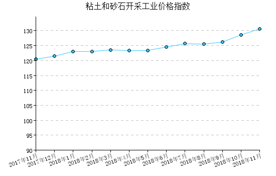 2018年11月(yue)(yue),粘(zhan)土和砂石開采工業產品出(chu)廠價(jia)(jia)格(ge)指數(shu)為130.56,比上(shang)月(yue)(yue)上(shang)漲(zhang)1.53%,比去(qu)年同(tong)月(yue)(yue)上(shang)漲(zhang)8.40%,一(yi)月(yue)(yue)至本月(yue)(yue)平(ping)均比去(qu)年同(tong)期上(shang)漲(zhang)8.77%。 圖 1:粘(zhan)土和砂石開采工業產品出(chu)廠價(jia)(jia)格(ge)指數(shu)