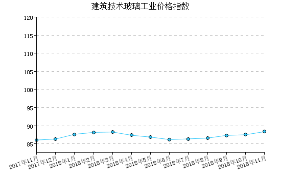 2018年(nian)11月,建筑(zhu)技(ji)術玻璃工業產品(pin)出廠價格指數為(wei)88.35,比(bi)上(shang)(shang)月上(shang)(shang)漲0.97%,比(bi)去年(nian)同月上(shang)(shang)漲2.67%,一月至本月平(ping)均比(bi)去年(nian)同期上(shang)(shang)漲4.37%。