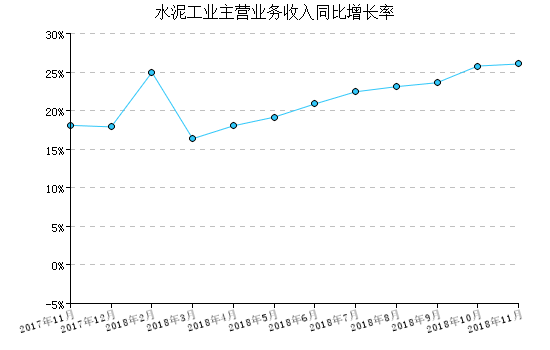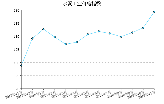 2018年(nian)11月,水泥工業產品出廠(chang)價格指(zhi)數為119.30,比上(shang)月上(shang)漲5.34%,比去年(nian)同(tong)月上(shang)漲20.72%,一月至本月平均比去年(nian)同(tong)期上(shang)漲22.53%。