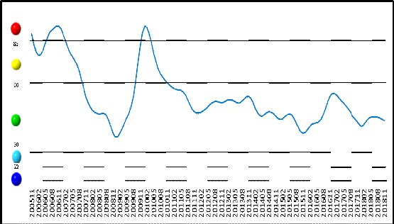中色鉛鋅產(chan)業月度(du)景(jing)氣指(zhi)數(shu)顯(xian)示(shi),2018年(nian)11月景(jing)氣指(zhi)數(shu)為35.7,較上月下降0.8個點,目前景(jing)氣指(zhi)數(shu)持續位于(yu)“正常(chang)”區(qu)間運行。中色鉛鋅產(chan)業月度(du)景(jing)氣指(zhi)數(shu)趨勢(shi)如圖1所示(shi)。