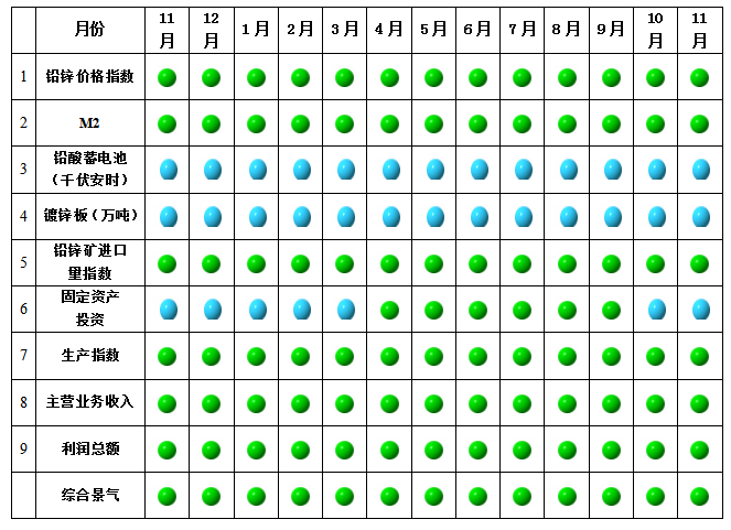 從中(zhong)色鉛(qian)(qian)鋅產業月度(du)(du)景(jing)(jing)氣信號(hao)燈可見(jian)(見(jian)圖2),2018年11月,在(zai)構成中(zhong)色鉛(qian)(qian)鋅產業月度(du)(du)景(jing)(jing)氣指數的9個指標(biao)(biao)中(zhong):鉛(qian)(qian)鋅價格指數、M2、鉛(qian)(qian)鋅礦(kuang)進口量、生(sheng)產指數、主(zhu)營(ying)業務收入(ru)、利潤總(zong)額6個指標(biao)(biao)位(wei)于(yu)“正常”區(qu)間;鉛(qian)(qian)酸蓄電池、鍍(du)鋅板、固定資產投資3個指標(biao)(biao)位(wei)于(yu)“偏冷”區(qu)間。