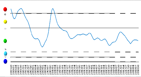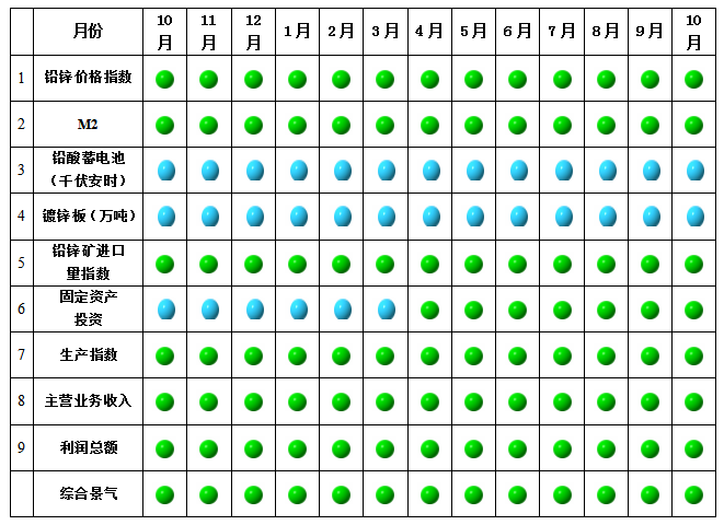 從中(zhong)(zhong)色鉛(qian)鋅(xin)產(chan)業(ye)月度(du)景氣(qi)信號(hao)燈可(ke)見(jian)(見(jian)圖(tu)2),2018年10月,在(zai)構成(cheng)中(zhong)(zhong)色鉛(qian)鋅(xin)產(chan)業(ye)月度(du)景氣(qi)指數(shu)(shu)的9個指標中(zhong)(zhong):鉛(qian)鋅(xin)價格指數(shu)(shu)、M2、鉛(qian)鋅(xin)礦進口量、固定(ding)資產(chan)投資、生產(chan)指數(shu)(shu)、主(zhu)營業(ye)務收入(ru)、利(li)潤總額位于(yu)“正(zheng)常”區(qu)間;鉛(qian)酸蓄(xu)電池、鍍鋅(xin)板位于(yu)“偏冷”區(qu)間。