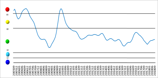 表1 2017年9月(yue)至(zhi)2018年9月(yue)中色鉛鋅產業(ye)月(yue)度景氣指(zhi)數