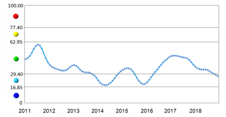 中色鋁冶煉(lian)產業月度景氣指(zhi)數(shu)顯(xian)示,2018年(nian)以來景氣指(zhi)數(shu)逐月回落,12月份降至27.6,較年(nian)初下降了9.4點,連續第2個月位于“偏冷(leng)”區間。中色鋁冶煉(lian)產業月度景氣指(zhi)數(shu)走勢見圖1。