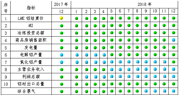 由(you)中色鋁(lv)(lv)冶(ye)煉產業景氣(qi)信(xin)號(hao)燈(見表2)可見,2018年12月份,在(zai)構成鋁(lv)(lv)冶(ye)煉產業景氣(qi)指(zhi)數的10個指(zhi)標(biao)(biao)中,商(shang)品房(fang)銷售面積(ji)、主營業務收入、利潤總額(e)等3個指(zhi)標(biao)(biao)處(chu)于“偏冷(leng)”區(qu)間;LME鋁(lv)(lv)結(jie)算價、M2、鋁(lv)(lv)冶(ye)煉投資總額(e)、發電(dian)量(liang)(liang)、氧化鋁(lv)(lv)產量(liang)(liang)、電(dian)解(jie)鋁(lv)(lv)產量(liang)(liang)、鋁(lv)(lv)材出口(kou)總量(liang)(liang)等7個指(zhi)標(biao)(biao)處(chu)于“正常”區(qu)間。