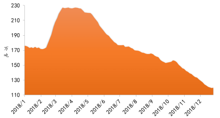 二是生(sheng)產(chan)(chan)環比(bi)(bi)(bi)小幅(fu)增(zeng)長(chang),庫(ku)存降(jiang)(jiang)幅(fu)有所收窄,國(guo)內(nei)鋁(lv)(lv)(lv)(lv)消費總(zong)體偏(pian)弱。經季調,2018年(nian)(nian)12月(yue)(yue)氧化鋁(lv)(lv)(lv)(lv)和電解鋁(lv)(lv)(lv)(lv)日(ri)產(chan)(chan)量(liang)分(fen)(fen)別(bie)為(wei)(wei)19.7萬(wan)(wan)(wan)噸(dun)、9.2萬(wan)(wan)(wan)噸(dun),環比(bi)(bi)(bi)分(fen)(fen)別(bie)增(zeng)長(chang)4.5%、3.1%。截止2018年(nian)(nian)12月(yue)(yue)底,鋁(lv)(lv)(lv)(lv)社會(hui)庫(ku)存量(liang)為(wei)(wei)120萬(wan)(wan)(wan)噸(dun),較年(nian)(nian)初下(xia)降(jiang)(jiang)了56萬(wan)(wan)(wan)噸(dun),其中12月(yue)(yue)份降(jiang)(jiang)幅(fu)為(wei)(wei)10萬(wan)(wan)(wan)噸(dun),環比(bi)(bi)(bi)收窄35.7%。同時,以銷定產(chan)(chan)的鋁(lv)(lv)(lv)(lv)材產(chan)(chan)品月(yue)(yue)產(chan)(chan)量(liang)處于年(nian)(nian)底低(di)(di)位,2018年(nian)(nian)11月(yue)(yue)降(jiang)(jiang)至411萬(wan)(wan)(wan)噸(dun),同比(bi)(bi)(bi)下(xia)降(jiang)(jiang)22.4%。反映出(chu)國(guo)內(nei)鋁(lv)(lv)(lv)(lv)消費總(zong)體偏(pian)弱,主要(yao)歸因于房地產(chan)(chan)及(ji)汽車(che)兩大主要(yao)領域分(fen)(fen)別(bie)維持低(di)(di)速增(zeng)長(chang)或已(yi)進(jin)入下(xia)行期。其中,汽車(che)產(chan)(chan)銷雙降(jiang)(jiang)已(yi)持續(xu)5個(ge)月(yue)(yue),11月(yue)(yue)份降(jiang)(jiang)幅(fu)創(chuang)新高,同比(bi)(bi)(bi)分(fen)(fen)別(bie)下(xia)降(jiang)(jiang)18.9%和13.9%。2018年(nian)(nian)以來(lai)鋁(lv)(lv)(lv)(lv)社會(hui)庫(ku)存變化見(jian)圖3。