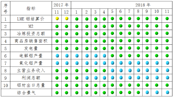 由中(zhong)色鋁(lv)(lv)冶(ye)(ye)煉(lian)產業景氣信(xin)號燈(見(jian)表2)可(ke)見(jian),2018年11月份,在構(gou)成(cheng)鋁(lv)(lv)冶(ye)(ye)煉(lian)產業景氣指數的10個指標中(zhong),氧化鋁(lv)(lv)產量(liang)、主營(ying)業務收(shou)入、利潤總(zong)額(e)(e)等3個指標處于“偏冷”區(qu)間;LME鋁(lv)(lv)結算價、M2、鋁(lv)(lv)冶(ye)(ye)煉(lian)投資總(zong)額(e)(e)、商(shang)品房銷售(shou)面積、發電量(liang)、電解鋁(lv)(lv)產量(liang)、鋁(lv)(lv)材出(chu)口總(zong)量(liang)等7個指標處于“正(zheng)常(chang)”區(qu)間。