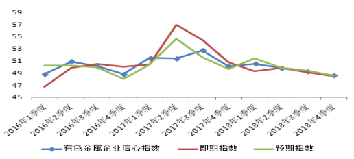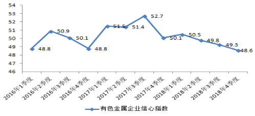 2018年第4季度,有色金屬企業信心指數為48.6,低于臨界點,較上期回落0.7。其中即期指數為48.5,預期指數為48.6,表明有色金屬企業對行業運行的信心繼續回落,但預期指數明顯向好。