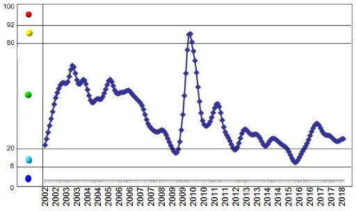 2018年7月,中經有色金屬產業景氣指數顯示為25.5,較上月上升0.2個百分點,在“正常”區域較平穩運行。