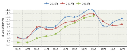 圖4 2018年(nian)全國紙(zhi)和(he)紙(zhi)板容器制造(zao)行業連續三年(nian)月度出口(kou)交貨值(zhi)對比