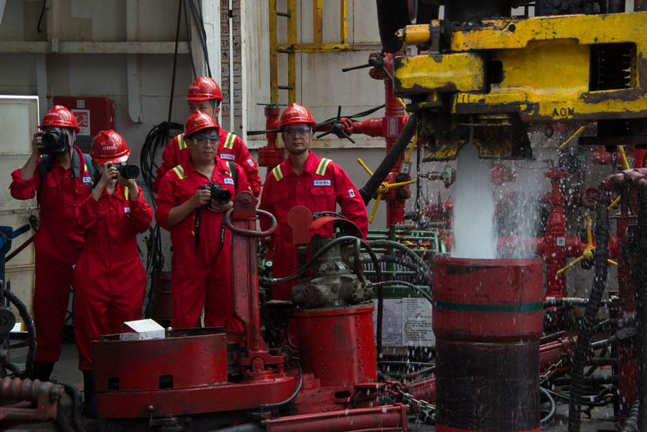 在位于平臺(tai)中部的井架塔下,攝影師(shi)們(men)記錄下“南海二號”鉆井作業的生產場景(jing)。(初(chu)魯京 攝)