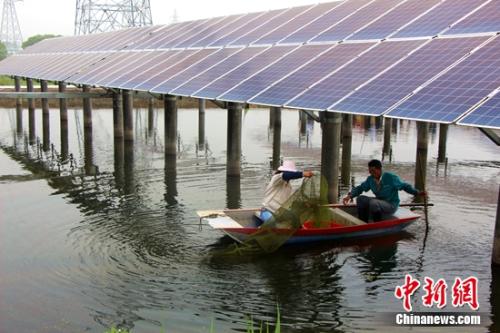 中國節能漁光互補項目 農戶正在捕撈小龍蝦