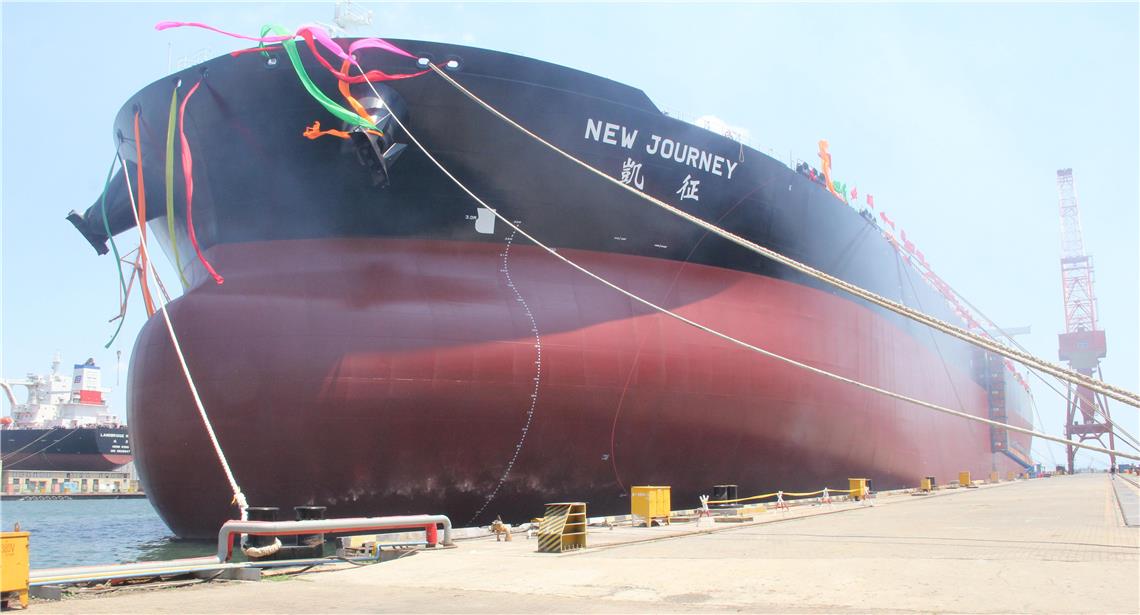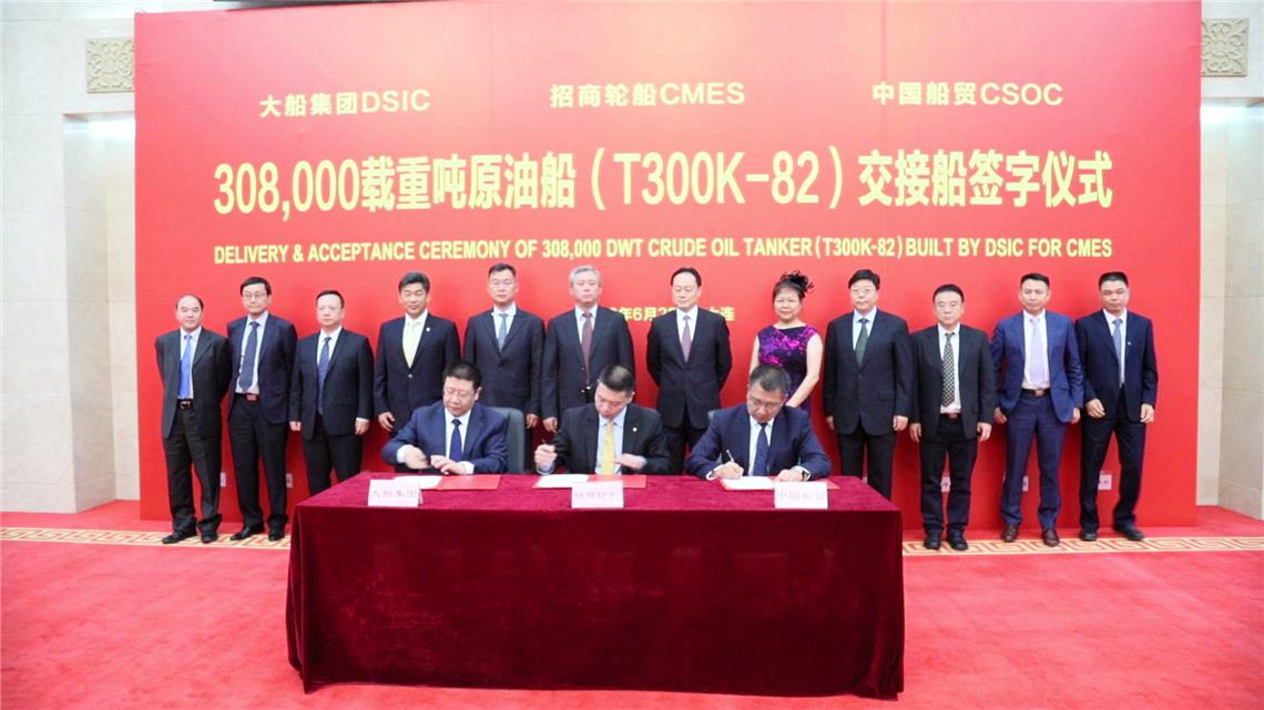 6月22日(ri),中船(chuan)重工(gong)大船(chuan)集團(tuan)為招商(shang)輪(lun)船(chuan)建造(zao)的全球(qiu)首艘30.8萬噸超大型智能原(yuan)油船(chuan)(VLCC)“凱征”輪(lun)在(zai)大連成(cheng)功交付。招商(shang)輪(lun)船(chuan)、大船(chuan)集團(tuan)與中國船(chuan)貿三(san)方代(dai)表在(zai)交接船(chuan)證書上(shang)簽字。