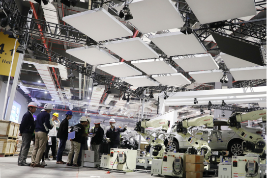 10月30日,在國家會展中心(上海),展方技術人員在展臺搭建現場對展品進行安裝調試。新華社記者 方喆 攝