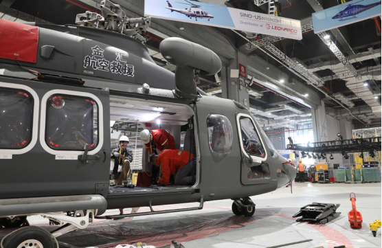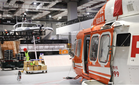 10月30日,在國家會展中心(上海),工作人員在一架直升機展品內安裝調試設備。新華社記者 方喆 攝
