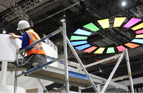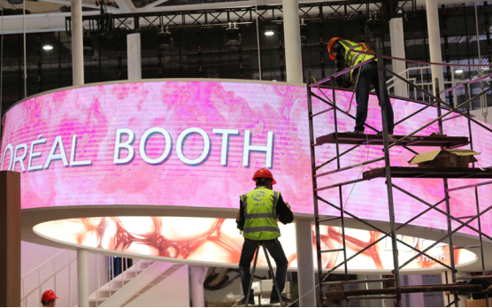 10月30日,在國家會展中心(上海),工作人員在展臺內調試一組LED顯示屏展板。新華社記者 方喆 攝