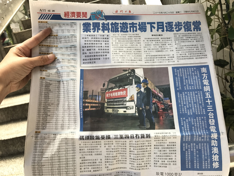 2017年8月29日那天,在《澳門日報》上看到了“南方電網”。林丹丹 攝