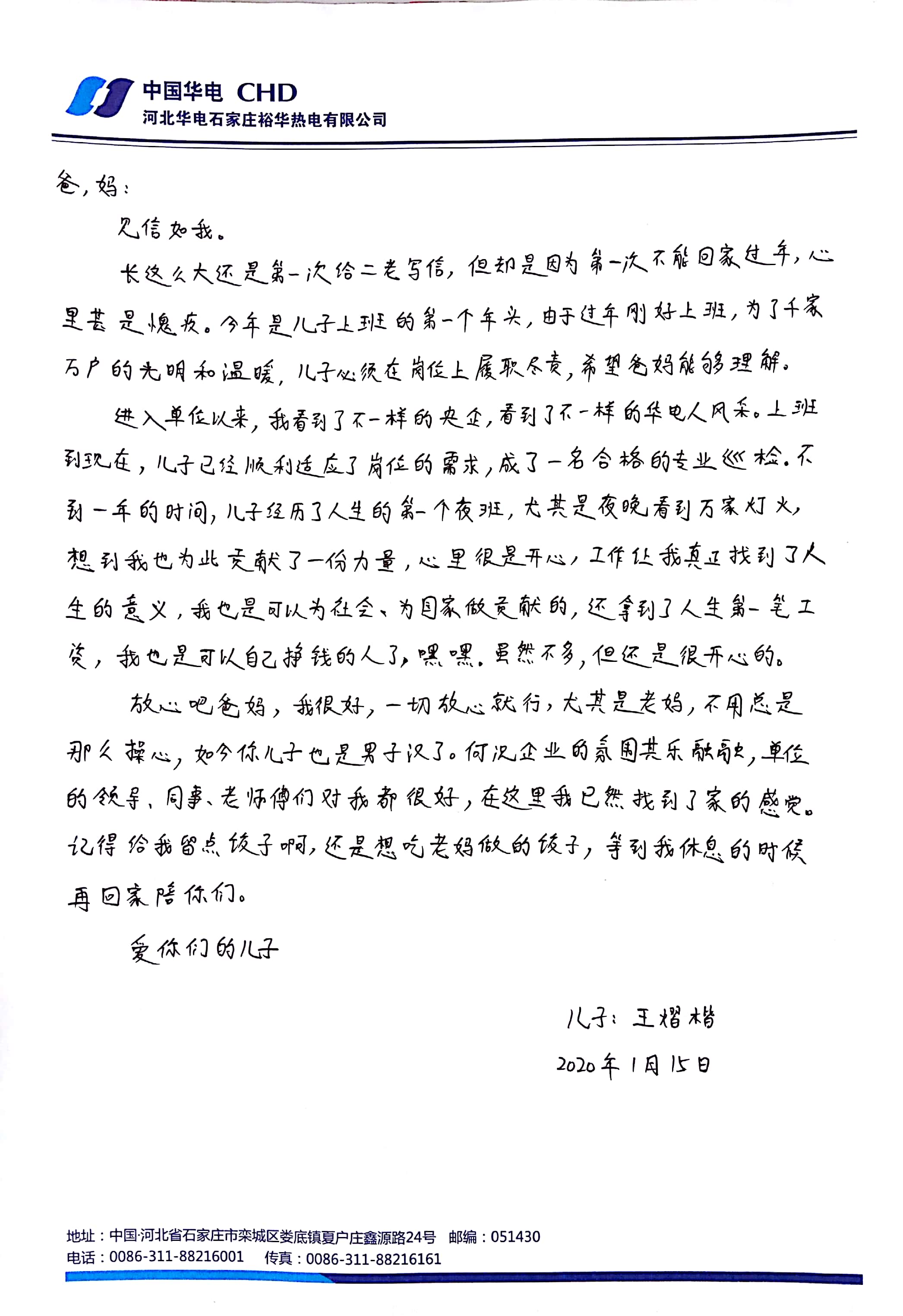 長這么大還是第一次給二老寫信,但卻是因為第一次不能回家過年,心里甚是愧疚。今年是兒子上班的第一個年頭,由于過年剛好上班,為了千家萬戶的光明和溫暖,兒子必須在崗位上履職盡責,希望爸媽能夠理解。