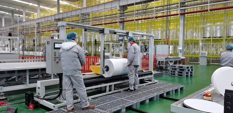 該智能(neng)化(hua)無(wu)紡布生(sheng)產(chan)(chan)線首次將AGV物(wu)流(liu)系(xi)統(tong)與智能(neng)倉儲系(xi)統(tong)應(ying)用(yong)在無(wu)紡布行(xing)業,生(sheng)產(chan)(chan)車間全面采(cai)用(yong)遠程調(diao)控(kong)(kong)技(ji)術(shu)進行(xing)自動(dong)(dong)化(hua)、信息化(hua)和(he)柔性化(hua)制造,可(ke)實(shi)時監控(kong)(kong)生(sheng)產(chan)(chan)數據和(he)自動(dong)(dong)檢測產(chan)(chan)品質量,實(shi)現了無(wu)紡布從原料(liao)入庫-自動(dong)(dong)拆(chai)包-自動(dong)(dong)上線-成品布自動(dong)(dong)分(fen)切(qie)-自動(dong)(dong)包裝入庫的全流(liu)程數字化(hua)智能(neng)化(hua)生(sheng)產(chan)(chan),與傳統(tong)生(sheng)產(chan)(chan)線相比,人員減少(shao)約40%,生(sheng)產(chan)(chan)效率(lv)提(ti)高30%,每天生(sheng)產(chan)(chan)口罩用(yong)紡粘(zhan)材(cai)料(liao)10噸,可(ke)供制作防護口罩1000萬個,并且產(chan)(chan)品具有(you)透(tou)氣、防水(shui)、無(wu)毒、無(wu)味、無(wu)菌、環保(bao)等優點。