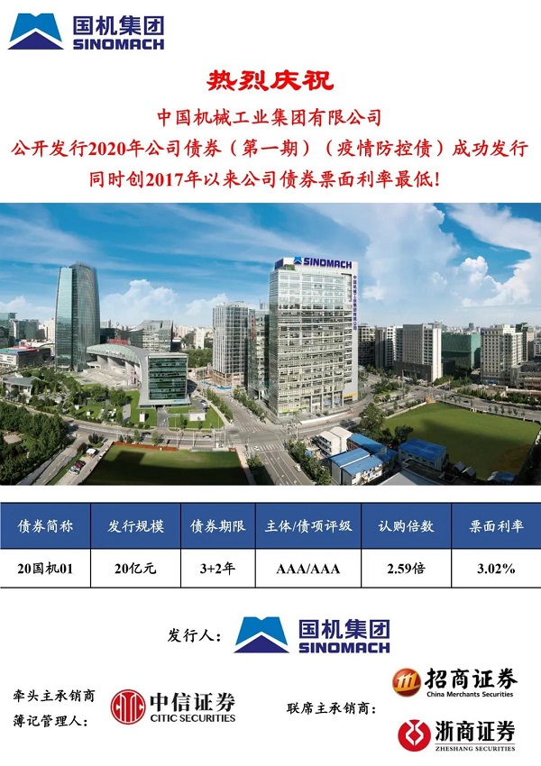 本期(qi)(qi)(qi)疫情防控(kong)公司債券期(qi)(qi)(qi)限(xian)為(wei)3+2年期(qi)(qi)(qi),發行過程中得到了投資者(zhe)的(de)踴躍(yue)認購和積極支持,最(zui)終發行票面(mian)利率(lv)僅為(wei)3.02%,創2017年以來公司債券票面(mian)利率(lv)最(zui)低,充分體現(xian)了資本市場對國機(ji)集團(tuan)的(de)高度認可。
