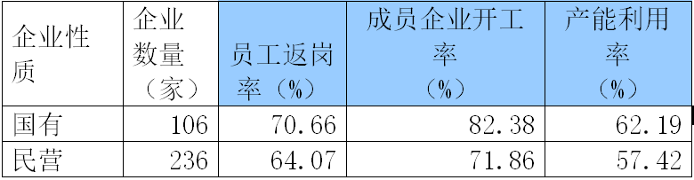 調(diao)查(cha)結(jie)果(guo)顯示,國有企(qi)(qi)業(ye)(ye)平均返崗(gang)(gang)率(lv)(lv)、成員企(qi)(qi)業(ye)(ye)開(kai)工(gong)率(lv)(lv)、產(chan)能(neng)利(li)用率(lv)(lv)分(fen)別為70.66%、82.38%、62.19%;民(min)營(ying)企(qi)(qi)業(ye)(ye)平均返崗(gang)(gang)率(lv)(lv)、成員企(qi)(qi)業(ye)(ye)開(kai)工(gong)率(lv)(lv)、產(chan)能(neng)利(li)用率(lv)(lv)分(fen)別為64.07%、71.86%、57.42%。總體上看,國有企(qi)(qi)業(ye)(ye)的各項指標明顯優于民(min)營(ying)企(qi)(qi)業(ye)(ye),民(min)營(ying)企(qi)(qi)業(ye)(ye)復工(gong)復產(chan)的困(kun)難和問題更多(duo)一些。