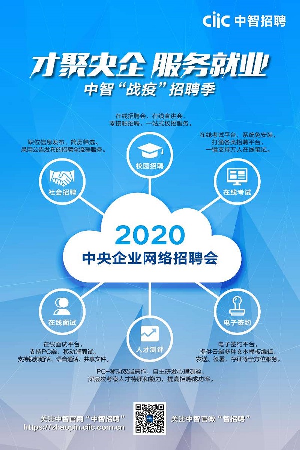 自新(xin)冠肺(fei)炎(yan)爆發(fa)以來,全面戰疫已進(jin)入關鍵(jian)階段(duan)。疫情(qing)面前(qian),穩就業就是穩大局,促進(jin)就業、維護穩定是中(zhong)央(yang)(yang)企(qi)業責無旁(pang)貸的社(she)會責任。為深入貫徹(che)落實習近平總(zong)書記(ji)關于(yu)新(xin)冠肺(fei)炎(yan)疫情(qing)防控工作(zuo)的重要指示批示精神(shen),認真落實黨中(zhong)央(yang)(yang)、國(guo)務院決(jue)策(ce)部(bu)署(shu),國(guo)務院國(guo)資委在國(guo)務院聯(lian)防聯(lian)控機(ji)制新(xin)聞發(fa)布(bu)會上明確提出采取靈活多樣的招(zhao)聘(pin)方(fang)式,積極(ji)穩妥推動人(ren)才招(zhao)聘(pin)工作(zuo)的要求,并于(yu)本月21日印發(fa)通知(zhi),鼓(gu)勵中(zhong)央(yang)(yang)企(qi)業與(yu)中(zhong)智集團合作(zuo)開展(zhan)網絡招(zhao)聘(pin)工作(zuo)。