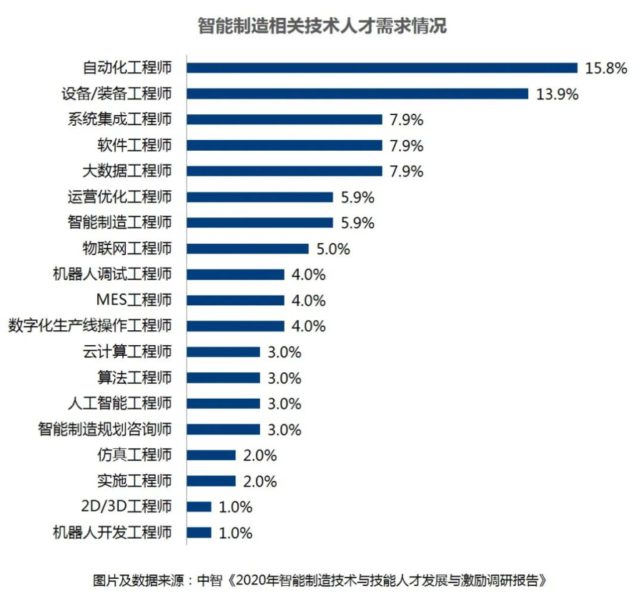 從企業招(zhao)聘智(zhi)能(neng)制(zhi)造(zao)相關(guan)技(ji)術人才的需(xu)(xu)求(qiu)來看,需(xu)(xu)求(qiu)量前三位依次(ci)是自(zi)(zi)動化類(lei)工程(cheng)(cheng)(cheng)師(shi)、設備(bei)(bei)/裝(zhuang)備(bei)(bei)工程(cheng)(cheng)(cheng)師(shi)、系統集成工程(cheng)(cheng)(cheng)師(shi)、軟件(jian)工程(cheng)(cheng)(cheng)師(shi)以及大數據工程(cheng)(cheng)(cheng)師(shi),智(zhi)能(neng)制(zhi)造(zao)技(ji)術人才的需(xu)(xu)求(qiu)更(geng)多地集中在(zai)電(dian)氣與自(zi)(zi)動化、互聯網、人工智(zhi)能(neng)等新興技(ji)術產(chan)業。