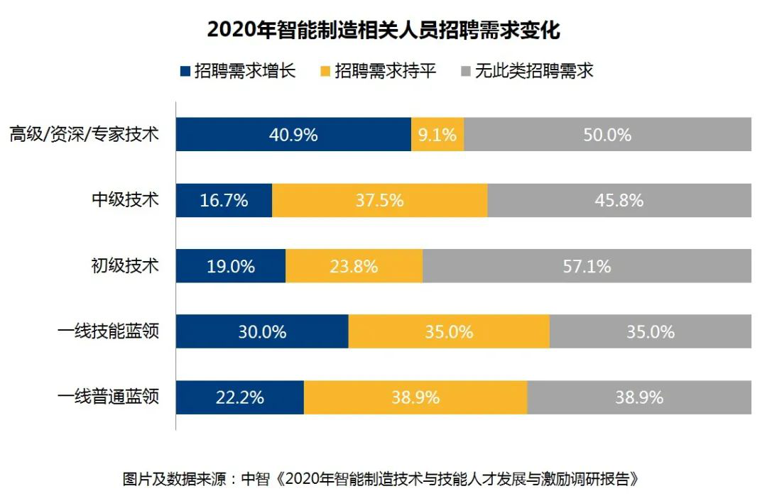 從企(qi)(qi)業(ye)(ye)(ye)(ye)2020年(nian)對(dui)(dui)智能(neng)(neng)制(zhi)造相(xiang)關技術(shu)(shu)和(he)技能(neng)(neng)人(ren)員(yuan)的招聘需(xu)(xu)求(qiu)來(lai)看:高級(ji)(ji)/資深/專家技術(shu)(shu)人(ren)員(yuan)的招聘需(xu)(xu)求(qiu)增長最多,數據(ju)顯示40.9%企(qi)(qi)業(ye)(ye)(ye)(ye)會擴招此類(lei)崗位;對(dui)(dui)于(yu)初級(ji)(ji)技術(shu)(shu)人(ren)員(yuan)來(lai)說(shuo),有近六成(cheng)企(qi)(qi)業(ye)(ye)(ye)(ye)沒有此類(lei)人(ren)員(yuan)招聘需(xu)(xu)求(qiu),也就是說(shuo)企(qi)(qi)業(ye)(ye)(ye)(ye)整(zheng)體對(dui)(dui)初級(ji)(ji)技工人(ren)員(yuan)的需(xu)(xu)求(qiu)偏低。此外,企(qi)(qi)業(ye)(ye)(ye)(ye)對(dui)(dui)于(yu)技能(neng)(neng)藍(lan)領(ling)的招聘需(xu)(xu)求(qiu)大(da)于(yu)一線普通藍(lan)領(ling),三成(cheng)企(qi)(qi)業(ye)(ye)(ye)(ye)表示針對(dui)(dui)技能(neng)(neng)藍(lan)領(ling)的招聘需(xu)(xu)求(qiu)增加,反映了在智能(neng)(neng)制(zhi)造轉型趨勢下,企(qi)(qi)業(ye)(ye)(ye)(ye)對(dui)(dui)于(yu)一線藍(lan)領(ling)員(yuan)工技能(neng)(neng)要(yao)求(qiu)的不斷提升。