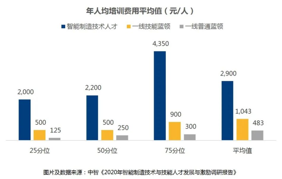培(pei)(pei)(pei)訓(xun)成本方面(mian),2020年一線(xian)普通藍領人(ren)均培(pei)(pei)(pei)訓(xun)費(fei)用平(ping)均值(zhi)為483元(yuan)/年,人(ren)均培(pei)(pei)(pei)訓(xun)時間(jian)(jian)為23小(xiao)時/年;2020年一線(xian)技能(neng)員工(gong)人(ren)均培(pei)(pei)(pei)訓(xun)費(fei)用為1043元(yuan)/年,人(ren)均培(pei)(pei)(pei)訓(xun)時間(jian)(jian)為33小(xiao)時/年;2020年智能(neng)制造技術人(ren)才人(ren)均培(pei)(pei)(pei)訓(xun)費(fei)用為2900元(yuan)/年,高(gao)位(wei)值(zhi)可達4350元(yuan),人(ren)均培(pei)(pei)(pei)訓(xun)時間(jian)(jian)36小(xiao)時/年。