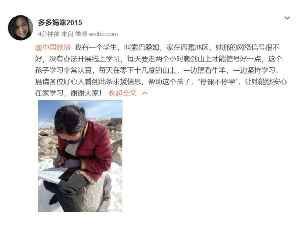 3月(yue)2號(hao),尹莉注(zhu)冊了微博賬號(hao),發了一(yi)條微博:“我有一(yi)個學生,叫索巴桑(sang)姆(mu),家在西藏地區,她(ta)那(nei)的(de)網絡信(xin)(xin)號(hao)很不好(hao),沒(mei)有辦法開展(zhan)線上學習(xi),每天要走(zou)兩個小時(shi)爬到山上才能信(xin)(xin)號(hao)好(hao)一(yi)點……”