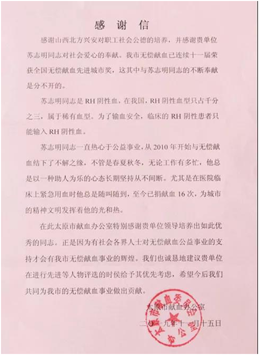近日,中國兵器工業集團北(bei)化研(yan)究院集團山西北(bei)方興(xing)安(an)公(gong)司收(shou)到(dao)了紅十字(zi)會太(tai)原市(shi)獻(xian)血(xue)委員(yuan)會辦公(gong)室寄來(lai)的(de)一封《感(gan)(gan)謝(xie)(xie)信》,感(gan)(gan)謝(xie)(xie)公(gong)司對職工社(she)會公(gong)德的(de)培(pei)養,感(gan)(gan)謝(xie)(xie)公(gong)司退(tui)休職工蘇(su)志明捐(juan)獻(xian)“熊貓血(xue)”16次的(de)社(she)會愛心奉獻(xian),感(gan)(gan)謝(xie)(xie)蘇(su)志明對太(tai)原市(shi)連續(xu)十一屆(jie)榮獲(huo)全國無(wu)償獻(xian)血(xue)先進城市(shi)獎(jiang)所作出(chu)的(de)貢獻(xian)。