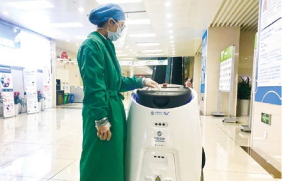 醫護人員正在使用中國移動捐贈的5G云端智能機器人