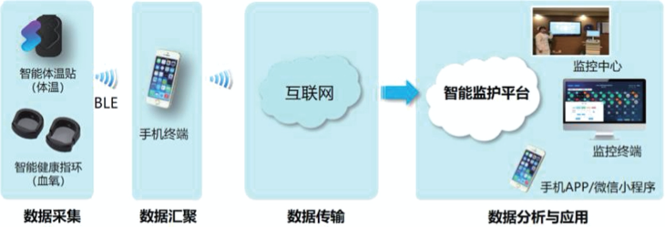 面向抗(kang)擊疫情一線的(de)醫護(hu)人(ren)員(yuan),可通(tong)過佩戴智(zhi)能(neng)體(ti)溫貼和智(zhi)能(neng)健(jian)康指環進行體(ti)溫、血氧的(de)遠程(cheng)連(lian)續監(jian)測(ce)。考慮到他(ta)們連(lian)續工作的(de)特殊(shu)性(xing),集成了輕巧舒適、不易脫落,且具備防(fang)水性(xing)能(neng)的(de)智(zhi)能(neng)健(jian)康指環用(yong)于監(jian)測(ce)血氧。醫護(hu)人(ren)員(yuan)存在極高的(de)感染風險(xian),僅提(ti)(ti)供口罩等(deng)防(fang)護(hu)用(yong)品(pin)遠遠不夠,因(yin)此提(ti)(ti)供動態、連(lian)續的(de)體(ti)溫、血氧監(jian)測(ce)手段,可通(tong)過手機App或(huo)微信小(xiao)程(cheng)序實現體(ti)征數據實時上(shang)傳(chuan)及異(yi)常告警提(ti)(ti)示(shi),進一步(bu)采(cai)取隔離及救(jiu)治措施。