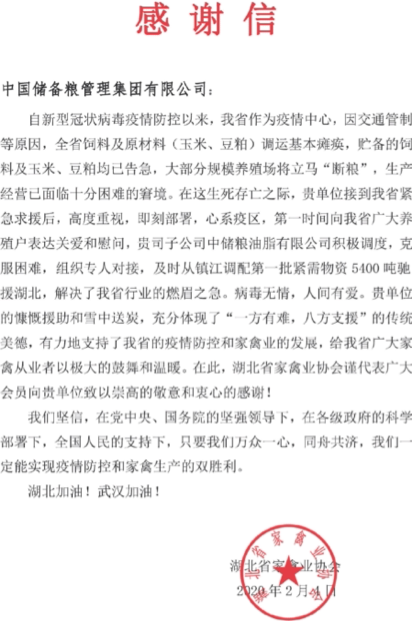 湖(hu)北(bei)省(sheng)家禽(qin)(qin)協會在發給中(zhong)儲(chu)糧(liang)集團(tuan)公司(si)的感(gan)謝(xie)信中(zhong)寫道,“中(zhong)儲(chu)糧(liang)油脂公司(si)在接到湖(hu)北(bei)省(sheng)緊急(ji)求援后(hou),高度重視(shi),即刻部署,心(xin)系疫區,第一時間向湖(hu)北(bei)省(sheng)廣大(da)養殖戶表達關愛和慰問,積極調(diao)度,克(ke)服(fu)困難,組織專人對接,及時從(cong)鎮江調(diao)配第一批緊需物資(zi)馳援湖(hu)北(bei),解決了(le)養殖業(ye)的燃眉(mei)之急(ji),充分體現(xian)了(le)‘一方有難,八方支援’的互助精神,有力支援了(le)湖(hu)北(bei)省(sheng)的疫情防控和家禽(qin)(qin)業(ye)的發展。”