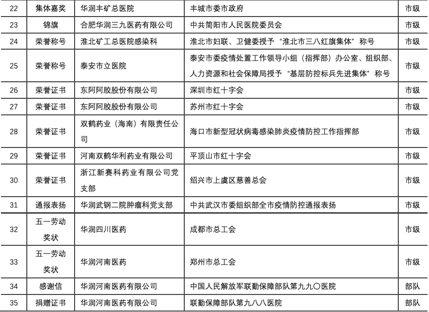 新冠病毒疫(yi)(yi)(yi)(yi)(yi)情(qing)(qing)(qing)(qing)(qing)發(fa)生以來,華潤(run)(run)集(ji)團(tuan)(tuan)從(cong)總部到各戰略業(ye)務單(dan)元、各級利(li)潤(run)(run)中(zhong)(zhong)心(xin)均啟動了(le)應(ying)急(ji)機制,充分發(fa)揮(hui)多元化企業(ye)的資源(yuan)優(you)勢(shi)和專(zhuan)業(ye)優(you)勢(shi),全(quan)體總動員,組合拳(quan)出擊(ji),積(ji)(ji)極打響(xiang)了(le)疫(yi)(yi)(yi)(yi)(yi)情(qing)(qing)(qing)(qing)(qing)保衛(wei)戰。華潤(run)(run)集(ji)團(tuan)(tuan)層面第(di)一時間成立應(ying)對疫(yi)(yi)(yi)(yi)(yi)情(qing)(qing)(qing)(qing)(qing)領(ling)導小(xiao)組,確定并啟動了(le)集(ji)團(tuan)(tuan)公共衛(wei)生事件應(ying)急(ji)預(yu)案等措施,迅速開展一系列部署;華潤(run)(run)集(ji)團(tuan)(tuan)旗下大(da)消費、大(da)健康(kang)、城市建設與運營、能源(yuan)服(fu)務、科技與金(jin)融等業(ye)務領(ling)域(yu)相關(guan)企業(ye)立足自身業(ye)務領(ling)域(yu),在疫(yi)(yi)(yi)(yi)(yi)情(qing)(qing)(qing)(qing)(qing)暴發(fa)、疫(yi)(yi)(yi)(yi)(yi)情(qing)(qing)(qing)(qing)(qing)攻堅的不(bu)同階段,積(ji)(ji)極發(fa)揮(hui)多元化資源(yuan)優(you)勢(shi)和專(zhuan)業(ye)優(you)勢(shi),全(quan)力響(xiang)應(ying)抗疫(yi)(yi)(yi)(yi)(yi)前(qian)線和后方的各類(lei)需(xu)求(qiu),全(quan)面布局防疫(yi)(yi)(yi)(yi)(yi)工作,主動投身到抗擊(ji)疫(yi)(yi)(yi)(yi)(yi)情(qing)(qing)(qing)(qing)(qing)的行動中(zhong)(zhong)。截(jie)至(zhi)2020年4月30日,華潤(run)(run)集(ji)團(tuan)(tuan)共捐贈(zeng)資金(jin)8407萬元,用于抗擊(ji)新冠疫(yi)(yi)(yi)(yi)(yi)情(qing)(qing)(qing)(qing)(qing)。