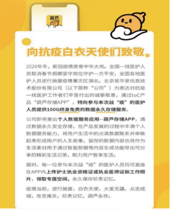 在做好(hao)公司疫情(qing)防控(kong)(kong)及復工(gong)復產(chan)同時(shi),易華錄(lu)堅決履行社(she)會責任,全(quan)力(li)以赴(fu)。葫蘆存儲(chu)(chu)APP,面向個(ge)人實現數(shu)據永久安(an)全(quan)存儲(chu)(chu),為表達對抗(kang)疫一線醫(yi)護(hu)(hu)工(gong)作者們辛苦付出的(de)誠摯(zhi)敬(jing)意,公司特向參與(yu)本次(ci)戰“疫”的(de)醫(yi)護(hu)(hu)人員提供(gong)100G終身(shen)免費(fei)的(de)數(shu)據永久存儲(chu)(chu)服務。此次(ci)之外,結合(he)各地(di)政(zheng)府(fu)的(de)需求,易華錄(lu)向社(she)會提供(gong)自(zi)研多(duo)款軟件(jian)產(chan)品,包括“城市大腦-疫情(qing)防控(kong)(kong)專(zhuan)題(ti)”“應急指揮調(diao)度移動版”“湖盤 web 端系統”“綜合(he)運輸疫情(qing)聯防聯控(kong)(kong)云(yun)服務”,系列提供(gong)云(yun)端服務,并限時(shi)向企業客戶免費(fei)推出“科技戰‘疫’,同舟共濟”系列云(yun)、網、安(an)全(quan)解決方案,充(chong)分利用技術(shu)專(zhuan)長(chang),為疫情(qing)防控(kong)(kong)保駕護(hu)(hu)航(hang)。