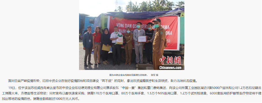 為助(zhu)力印(yin)度(du)(du)尼(ni)西(xi)亞政府抗擊新冠疫(yi)情,公司多方籌措為印(yin)度(du)(du)尼(ni)西(xi)亞當(dang)地(di)政府和醫(yi)療部門(men)捐贈了170萬(wan)個(ge)醫(yi)用(yong)一次性(xing)醫(yi)用(yong)口罩、80萬(wan)個(ge)醫(yi)用(yong)手套、1.5萬(wan)個(ge)N95醫(yi)用(yong)口罩、1.2萬(wan)個(ge)試(shi)(shi)劑測試(shi)(shi)盒、6000套防護服等醫(yi)療物資,同時為園(yuan)區(qu)內印(yin)度(du)(du)尼(ni)西(xi)亞員工及當(dang)地(di)村(cun)(cun)民(min)發放了大(da)(da)米、方便面等生活物資,受到(dao)了當(dang)地(di)政府和周邊(bian)村(cun)(cun)民(min)的(de)極大(da)(da)贊譽,營造(zao)了良好的(de)企業發展(zhan)外部環境。