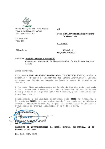 建設羅安達地區索約電站連接線項目表揚信(翻譯)