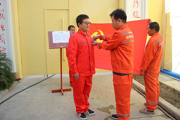 中鐵十四局駐阿富汗使館項目年輕黨員姬宏偉(左)轉正,在莊嚴的黨旗下立下誓言,成為一名合格的共產黨員。