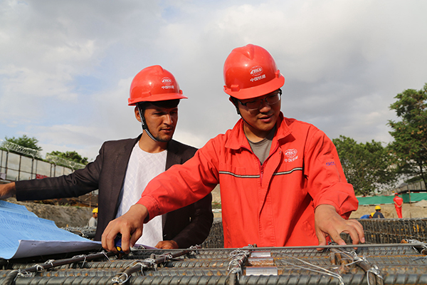援阿富汗國家職業技術學院項目施工中,中方青年工程師姬宏偉(右)帶領阿方員工一同檢查工程質量。