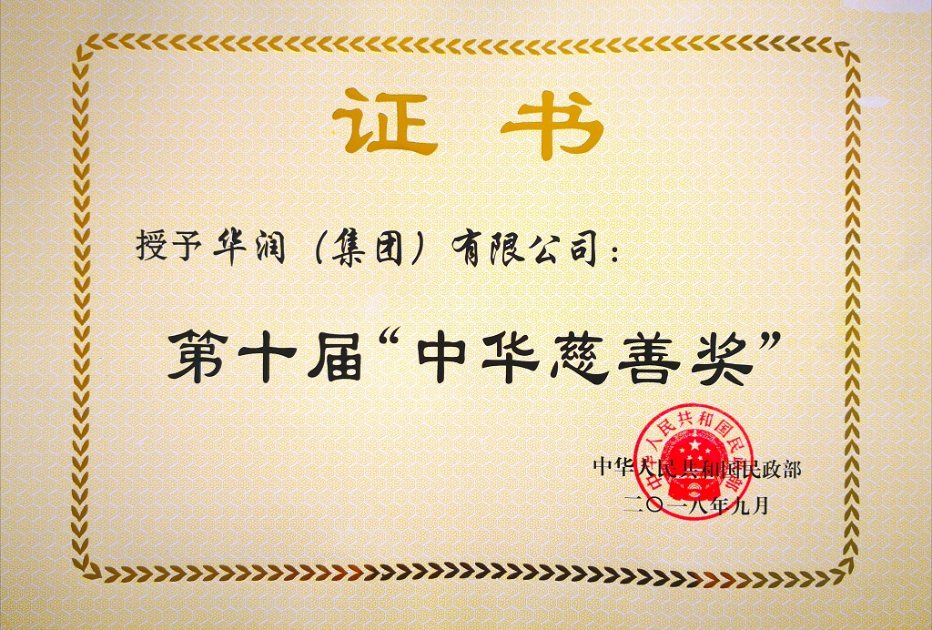 2018年(nian)9月13日,在由(you)民政(zheng)(zheng)部(bu)舉辦的第(di)(di)十(shi)屆“中(zhong)(zhong)華(hua)(hua)慈善獎”表(biao)彰大會上,華(hua)(hua)潤集團榮獲(huo)第(di)(di)十(shi)屆“中(zhong)(zhong)華(hua)(hua)慈善獎”捐贈企業殊榮。“中(zhong)(zhong)華(hua)(hua)慈善獎”每(mei)兩年(nian)評(ping)選(xuan)表(biao)彰一(yi)次(ci),是中(zhong)(zhong)國公益慈善領域中(zhong)(zhong)的最高政(zheng)(zheng)府獎。