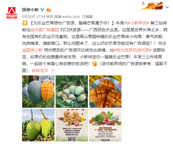 5月(yue)30日,“百縣(xian)(xian)百品(pin)央(yang)字號”暨(ji)“小(xiao)(xiao)新(xin)帶貨(huo)”第三場(chang)直(zhi)播(bo)將走進革命老區、世界長壽之(zhi)(zhi)鄉廣西百色市(shi)樂(le)業(ye)縣(xian)(xian)。樂(le)業(ye)縣(xian)(xian)是中(zhong)(zhong)國(guo)廣核(he)集團有限公司對口扶(fu)貧縣(xian)(xian),是國(guo)家(jia)級深(shen)度貧困縣(xian)(xian),也(ye)是目(mu)前全國(guo)52個未脫貧縣(xian)(xian)之(zhi)(zhi)一(yi)。小(xiao)(xiao)新(xin)將在@國(guo)資小(xiao)(xiao)新(xin)快手平臺發起(qi)直(zhi)播(bo),攜手中(zhong)(zhong)廣核(he)掛職(zhi)廣西百色市(shi)樂(le)業(ye)縣(xian)(xian)副(fu)縣(xian)(xian)長曹文飛,帶貨(huo)中(zhong)(zhong)國(guo)國(guo)家(jia)地理標志產(chan)品(pin)樂(le)業(ye)芒果,以及更(geng)多樂(le)業(ye)本地特色農(nong)產(chan)品(pin)。