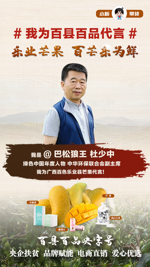 經(jing)與當地協商,我們(men)最終(zhong)確定綠色中(zhong)(zhong)國(guo)年度人物(wu)、中(zhong)(zhong)國(guo)環保聯合會副主席(xi)@巴(ba)松狼王 杜少中(zhong)(zhong),將為廣西樂業芒果綠色公益(yi)代言(yan)!