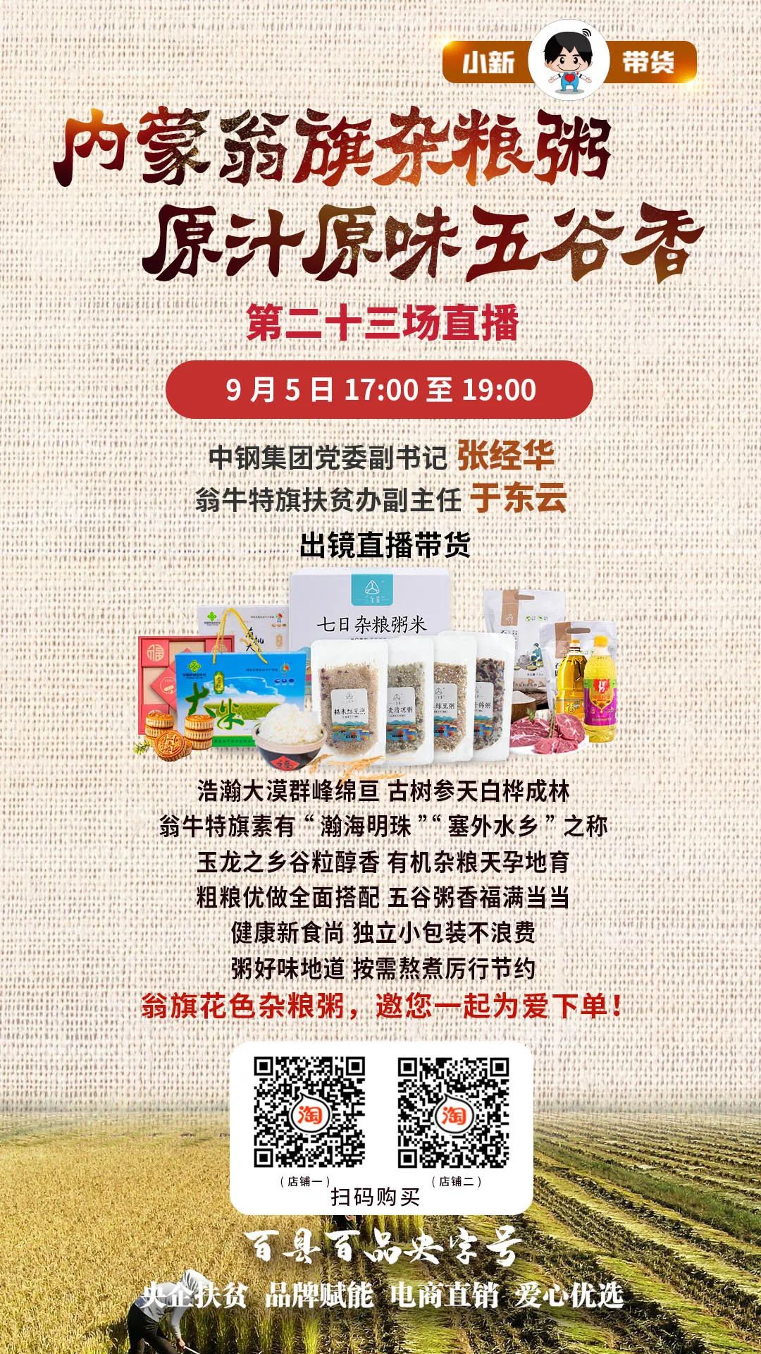9月5日(ri)17:00—19:00,#百(bai)縣(xian)百(bai)品央(yang)字號(hao)#暨#小新帶貨(huo)#,第二(er)十三場來到中鋼(gang)集團定點(dian)扶貧縣(xian)——內蒙古(gu)自治區赤峰(feng)市(shi)翁牛特(te)旗。為您直播帶貨(huo)純天(tian)然(ran)、無(wu)污染的翁牛特(te)旗雜糧粥等當地有機農(nong)產(chan)品。