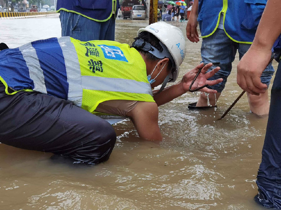 中建三局湖北葛店新城項目組織青年員工,在工地周邊搶挖排水溝,對積水嚴重處的下水管道進行疏通、清理。