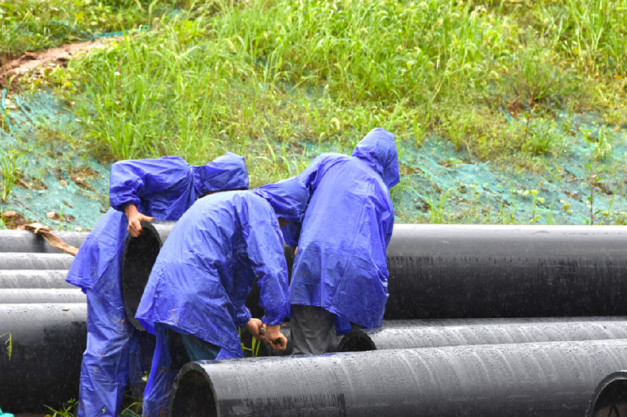 連(lian)續一周的強降雨致使(shi)城(cheng)區(qu)(qu)港道積(ji)水(shui),市民(min)出(chu)行(xing)受(shou)阻(zu),武(wu)穴項(xiang)目部(bu)安排5臺挖(wa)機、15名施工人員配合市防汛指揮部(bu)安裝臨時PE管(guan),通過增(zeng)壓泵將城(cheng)區(qu)(qu)內積(ji)水(shui)逐步排出(chu)。經(jing)過兩天兩夜的堅守(shou),7月9日,橫貫城(cheng)區(qu)(qu)、長江的排澇PE管(guan)安裝完畢,城(cheng)區(qu)(qu)內積(ji)水(shui)得以緩解。
